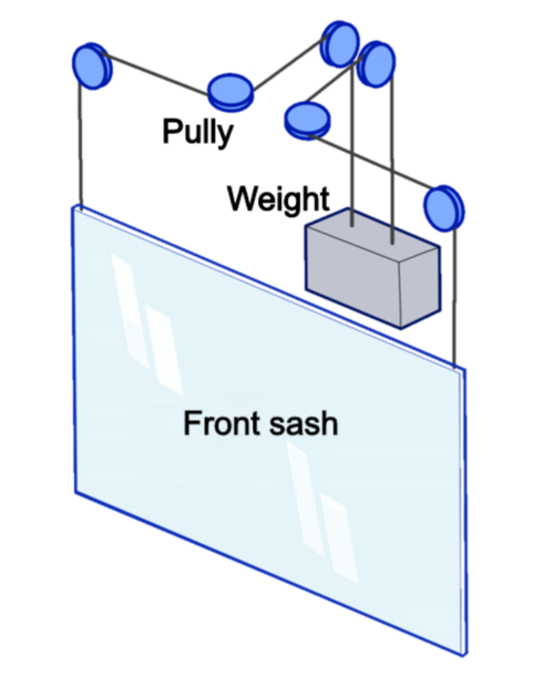Tempered glass is often used for the front sash. Weights of the same mass are on the back side and are balanced by being connected with wires and belts.