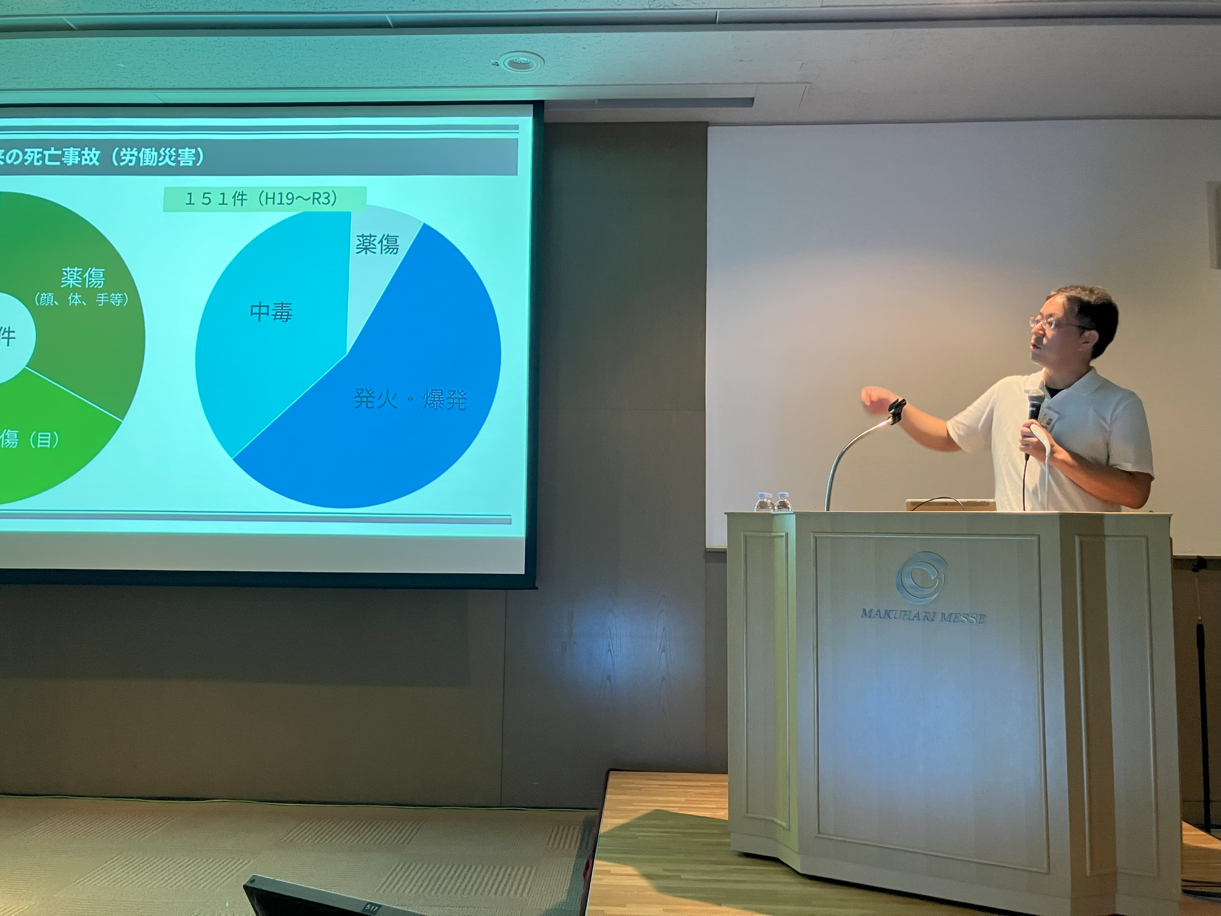また、9月4日(木)10時半から国際会議場301会議室にて、『ラボにおける”自律的”リスク管理とは』というタイトルにて、富田副理事長、大島理事長、春原副理事長のリレー形式で講演が行われました。大学の研究実験室における事故事例の紹介や、リスクアセスメントのやり方、局所排気装置に関する話などがトピックとして挙げられ、多くの聴講者がメモを取るなど熱心に聴き入る姿が見受けられました。会場は事前予約により満席、当日席まで準備されるなど、大変盛況な会となりました。その時に使用された発表スライドの一部をこちらに掲載させていただきます。