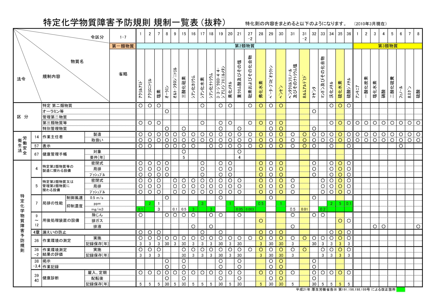 特定化学物質障害予防規則 規則一覧表(一部抜粋)