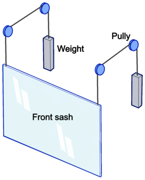 Tempered glass is often used for the front sash. Weights of the same mass are on the back side and are balanced by being connected with wires and belts.